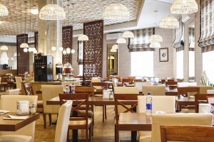 Ресторан «Шале» предлагает формат, сочетающий шведский стол с холодными закусками и десертами, а также индивидуальную подачу горячих блюд по меню. Выпечка и основные позиции меню не повторяются в течение 10 дней, а оформление блюд соответствует ресторанному стандарту — каждая подача продумана до деталей.