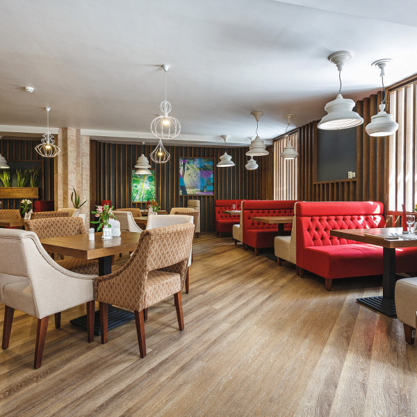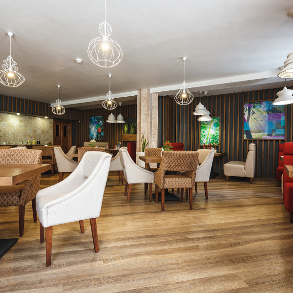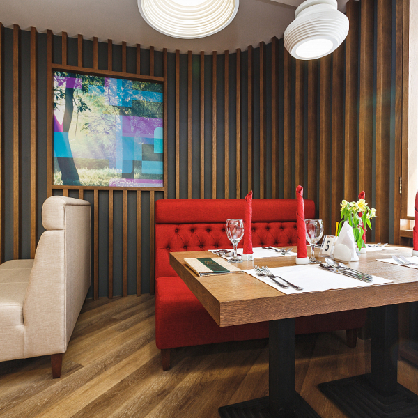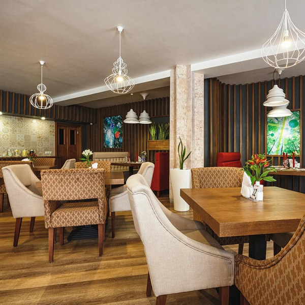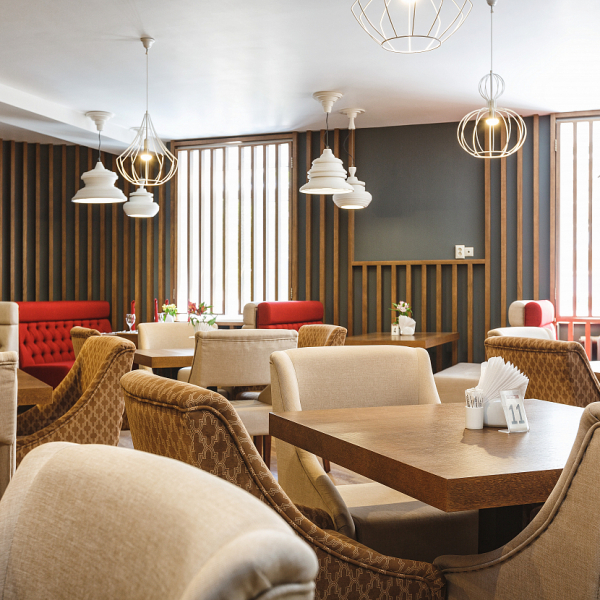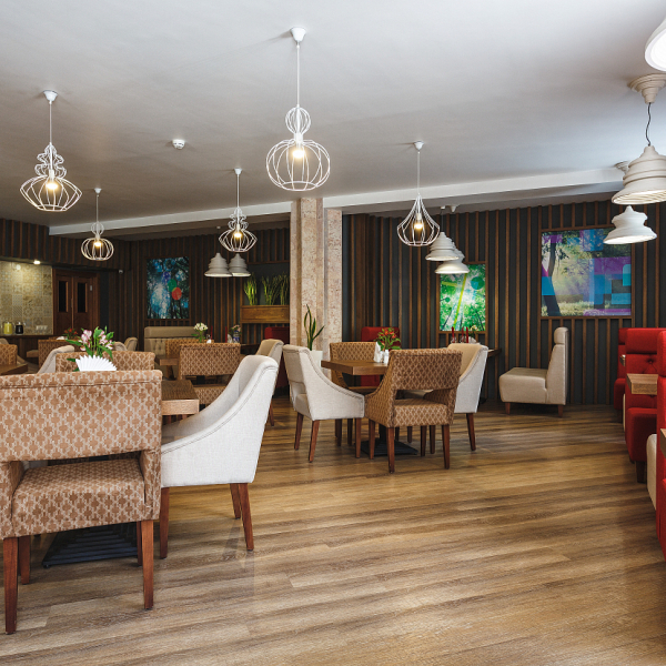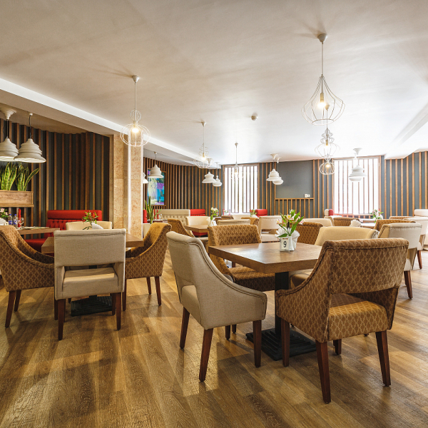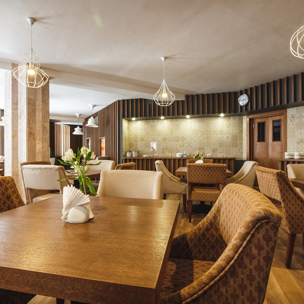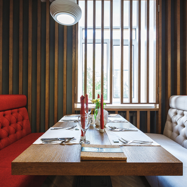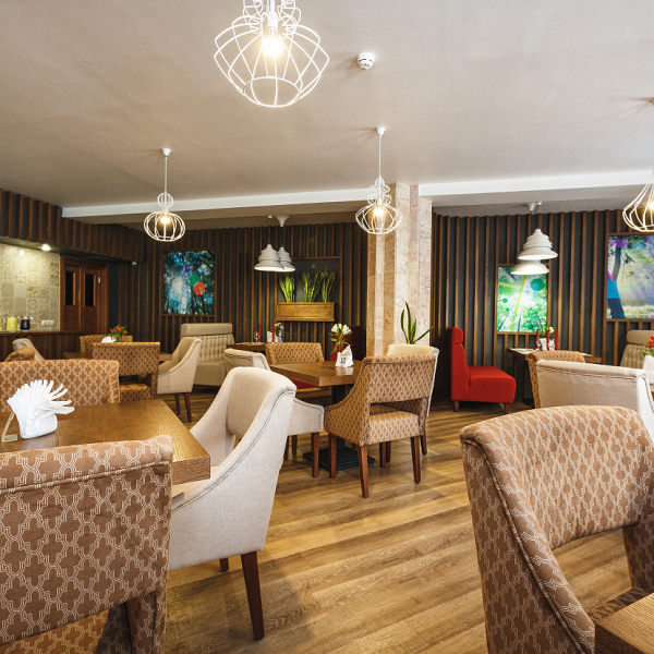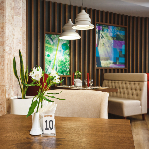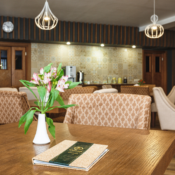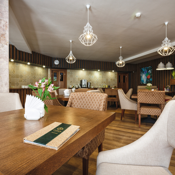 Обедать можно в уютном зале на 40 посадочных мест. Услуга включена в стоимость проживания для гостей, размещённых в номерах категорий «Люкс», «Люкс Комфорт» и «Гранд Люкс».